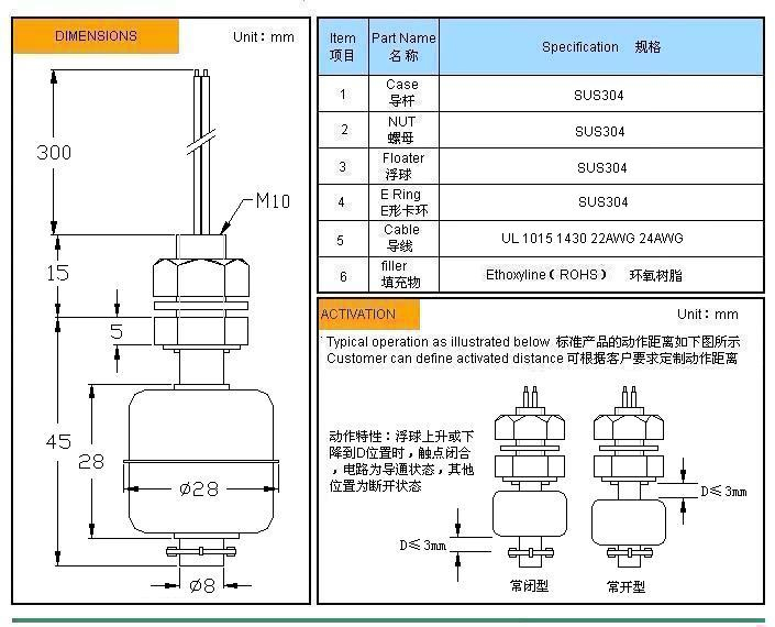 采用進口開關(guān)元件,體積輕巧,工作原理簡單,可靠性高,價格便宜,有不同材質(zhì)及規(guī)格的浮球可供選擇,電氣參數(shù)可根據(jù)客戶要求改變,特殊規(guī)格亦可定制。