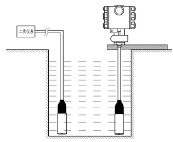 1. 在開(kāi)口容器中測(cè)量靜止流體液位時(shí),把液位變送器垂直投入到容器的底部,在容器的開(kāi)口處將連接變送器的電纜線和接線盒固定。當(dāng)介質(zhì)粘稠度較大時(shí),可以加裝套管或者支架,保證變送器可以投入到容器的底部。