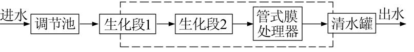 圖 1中回注水處理工藝流程中虛線部分為車載部分。工藝流程重點(diǎn)對(duì)工藝流程生化段1、生化段2、管式膜處理器詳細(xì)說(shuō)明〔2, 3, 4〕,具體工藝流程見(jiàn)圖 2。